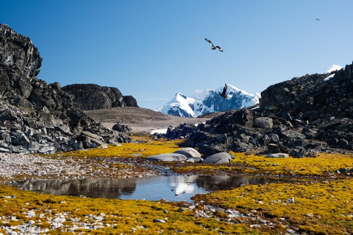 Figure 4. Photo of a wet valley with extensive moss carpets on Lagoon Island near Rothera Station (British Antarctic Survey).